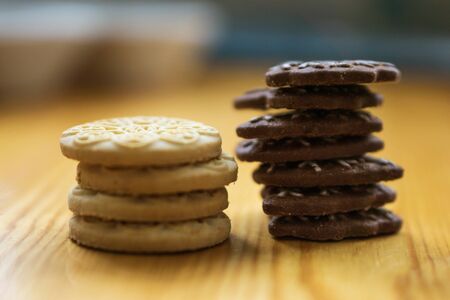 Stacked homemade biscuit sweet cookie on rustic wooden table