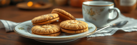 Delicious cookies with creamy filling arranged on a table with decorative background elements in a cozy setting