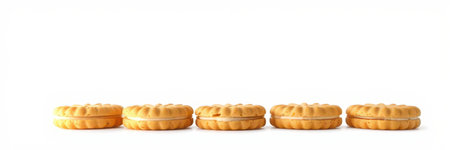 Delicate cream-filled cookies arranged in a straight line against a white backdrop