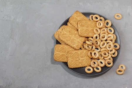 Sweet cookies and bagels for tea on a black plate on a gray background. Top view. Copy space.
