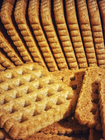 Stacked golden biscuits with grid texture and scalloped edges in close-up