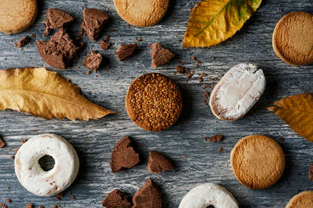 high angle view of some mantecados, polvorones and roscos de vino, a typical christmas confection in spain, on a rustic gray wooden table