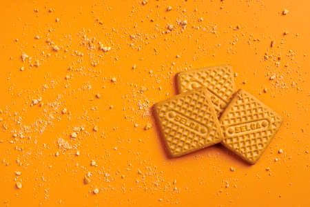 KALININGRAD, RUSSIA - 03.27.2021 - Selga biscuits. Delicious Latvian snack, SELGA square cookies on orange background, copy space with scattered crumbs