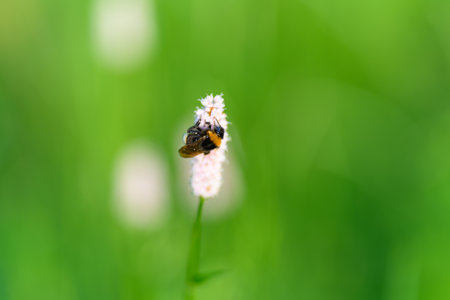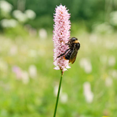 Bee, bumblebee on pink flower, snakeweed , bistort in the meadow in summer, spring in the daytime on a blurred background. Close-up. Floral background. Selective focus.