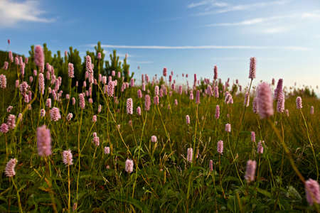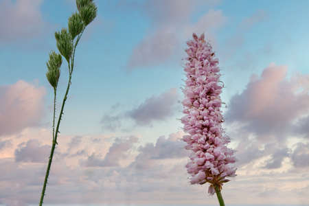 Pink flowers of common bistort, against the background of the sky in spring, summer. Selective focus. Blurred background. Floral spring background