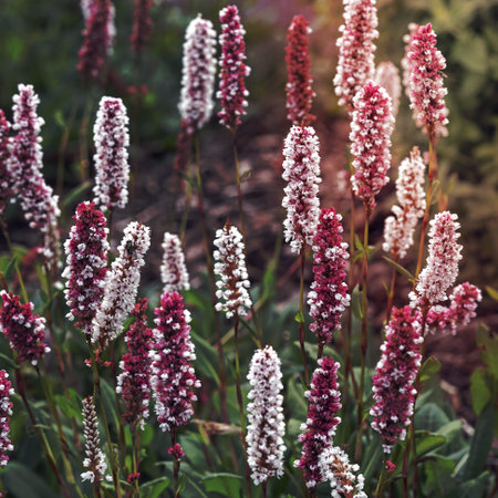 Pretty flower spikes of Persicaria amplexicaulis in a garden with soft focus