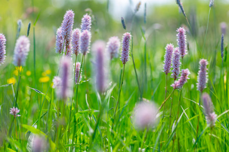 Close-up of pink wildflowers in a natural setting. Bistorta officinalis