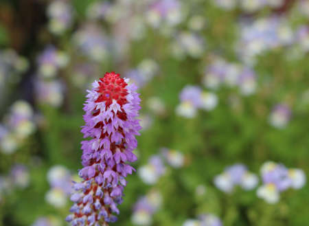 Beautiful primula vialii in purple and red with foliage with copy space