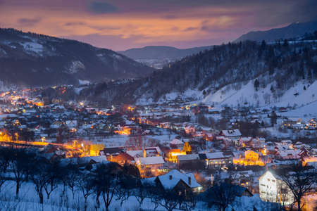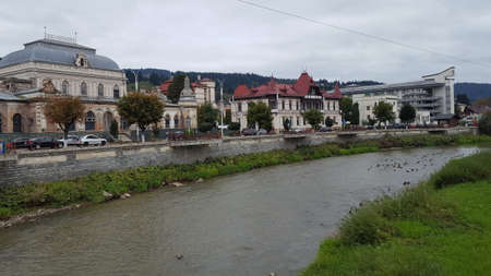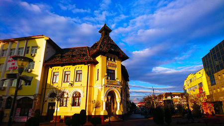 Zarnesti, Romania - September 11, 2016: Scenic sunrise over the streets in the historic center of Zarnesti city, the start point for tourists and hikers to explore the Piatra Craiului National Park.