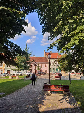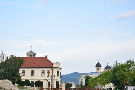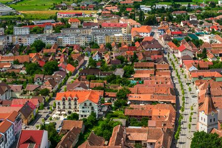 Medias, Romania, 14 July 2021: City landscape with Ferdinand I King Square (Piata Regele Ferdinand I) and green park in the old city center, in Transylvania (Transilvania) region, Romania, in a sunny summer day