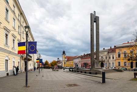 Cluj-Napoca, Romania - October 18.2025. A wide view of the tall concrete Memorial to the Martyrs of the Revolution in a pedestrian square in Cluj-Napoca, Romania, under a cloudy sky
