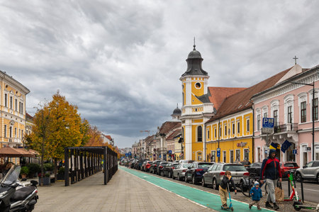 Cluj-Napoca, Romania - October 18.2025. Eroilor Avenue in Cluj-Napoca, Romania, featuring historic buildings, a green painted bicycle lane, and electric scooters under a dramatic cloudy sky