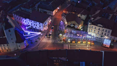 Slovenska Bistrica, Slovenia - Dec 25 2019: Aerial view of Christmas fair on main square in Slovenska Bistrica, a small medieval town in Slovenia, decorative lights illuminate the streets