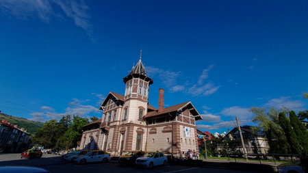 Campulung Muscel, Romania - June 20, 2020: Town hall or city hall in Campulung Muscel, Arges county, Romania. Beautiful architectural building located in the city center
