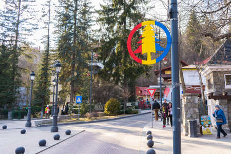 Sinaia, Romania - March 09, 2019: Mountain area / pine tree area sign on light post in Sinaia, Prahova county, Romania.