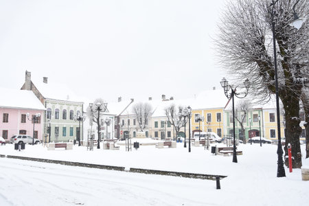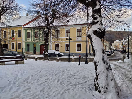 Old buildings in the Central Square of Bistrita. February 2025, Romania.