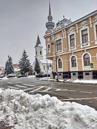 The Old Post Office and the Reformed Church in Bistrita in the winter of 2020, Romania
