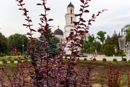Close-up of wet red foliage with sparkling raindrops, with a historic white church and lush green park softly blurred in the background