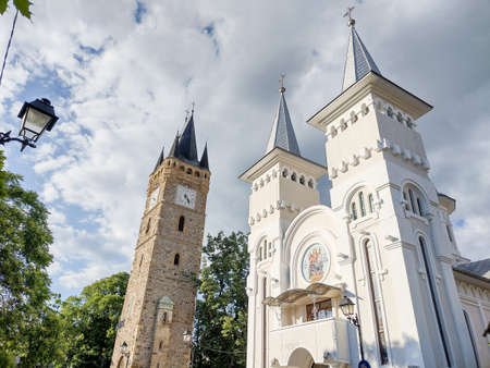Stephen Tower (Turnul Stefan) and an orthodox church in Baia Mare city, Romania