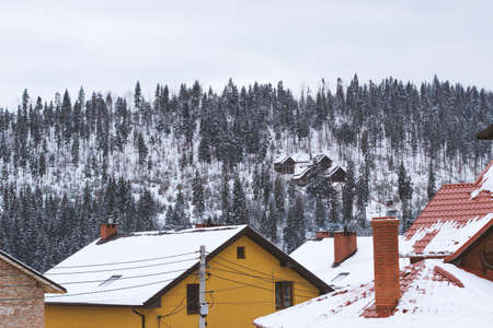 A high angle shot of the roofs of the houses with chimneys and the snowy forest in the background