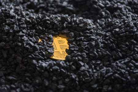 Bitcoin gold cryptocurrency buried in black stones. The money of the future