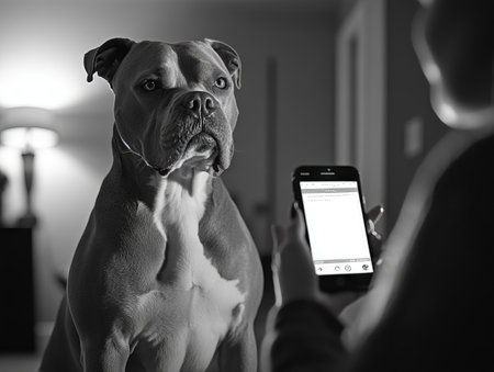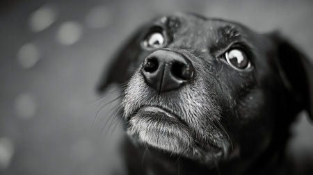 A loyal dog lies comfortably with its head slightly tilted, gazing intently with bright eyes, exuding warmth and affection in a relaxed indoor environment.