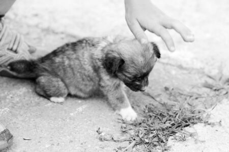 Black and white Brown and white puppy in the grass playing with a child s hand