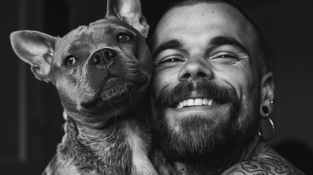 A man tenderly holds a small dog in his arms, showing affection and care.