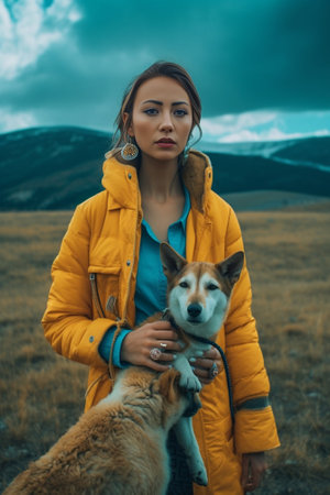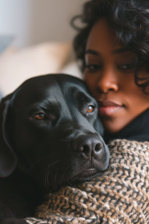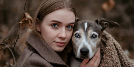 A young Caucasian woman cuddles her dog, sharing a warm moment in a serene, natural setting.