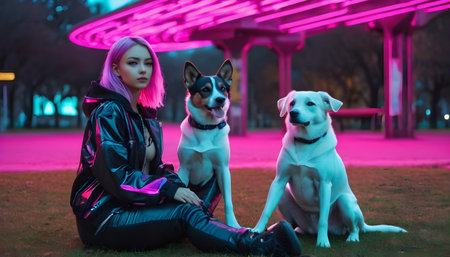 A girl with a short haircut keeps a Chihuahua dog in an orange vest High quality photo : Generative AI
