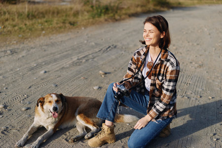Woman kneeling beside a dog on a dusty road, outdoor casual scene with a plaid shirt, jeans and boots, joyful expression, field setting and warm sunlight.