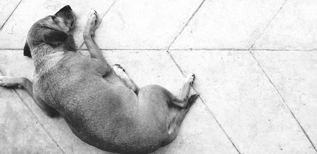Top view of dog sleeping or lying on the rough cement floor or gray ground with line and copy space in black and white style - Animal and Pet concept