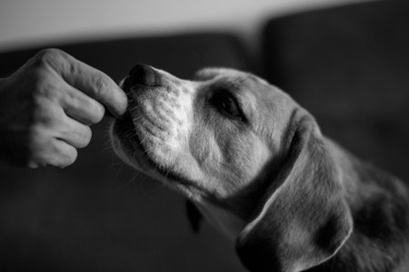 High angle view of a white dog grabbing a treat from owners hand, motion blur, selective focus.