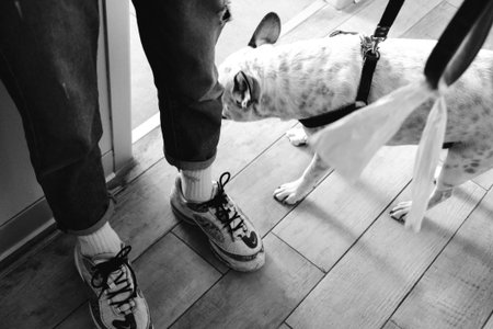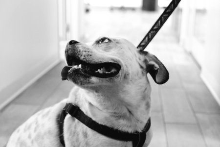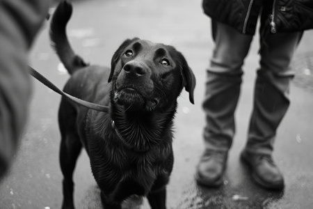 A grey scale shot of a black dog on a leash sitting on the sidewalk