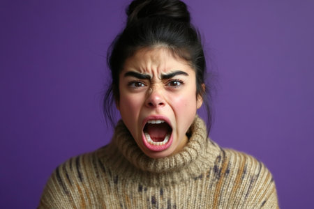 “Young Woman Expressing Anger with Open Mouth Against Purple Background.â€