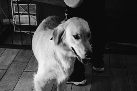 Monochrome portrait of cute golden labrador breed dog standing at sidewak in night. Dog is looking at aside