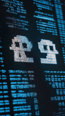 Close up of computer screen displays blue pixelated text and symbols, creating digital and futuristic atmosphere. image suggests themes of technology and coding