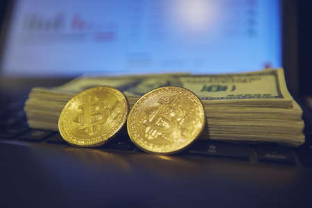 Golden symbolic coin Bitcoin on banknotes of one hundred dollars. Exchange bitcoin cash for a dollars. Cryptocurrency on US dollar bills.