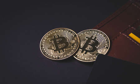 Bitcoin coin in wallet for carrying money and coins. Сryptocurrency trading exchange. BTC mining and investing concept. Blockchain and financial technology. Crypto prices and market capitalization