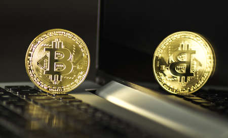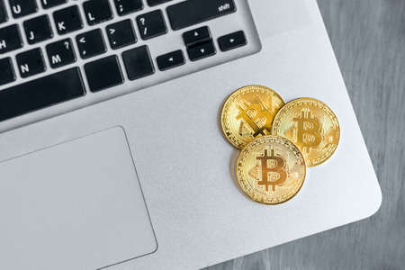 Bitcoin gold coin on a laptop computer background. Cryptocurrency trading concept.