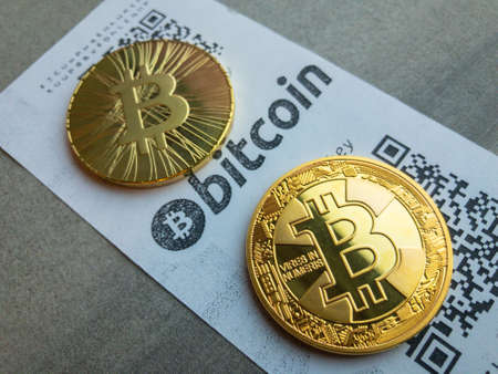 Golden bitcoin coin lying on the paper receipt