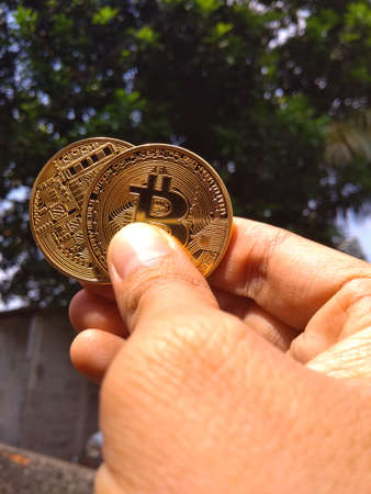 hand Holding two pieces of bitcoin at park at bright sunny day