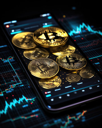 golden bitcoin coins on a smartphone, representing the electronic currency