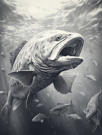 Underwater closeup of a predatory fish with open mouth, murky water, eerie lighting, detailed textures, natural habitat setting