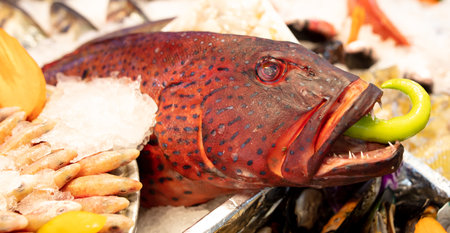 A vendor in a blue uniform holds a shiny grouper fish above a market stall filled with ice and various fresh seafood, capturing the lively essence of the market.
