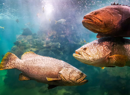Large fish Giant grouper swimming in aquarium. Epinephelus lanceolatus, common brindlebass, brown spotted cod, or bumblebee grouper