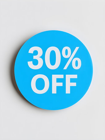 White '30% OFF' Text on a Blue Round Paper Note. White Background