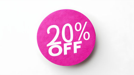 White '20% OFF' Text on a Fuchsia Round Paper Note. White background with copy space