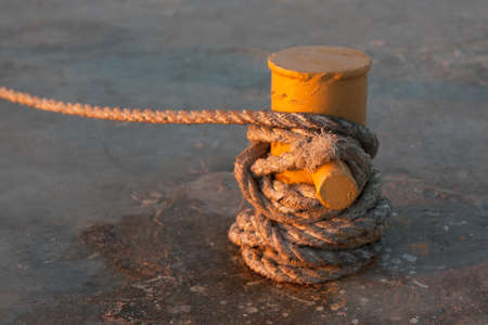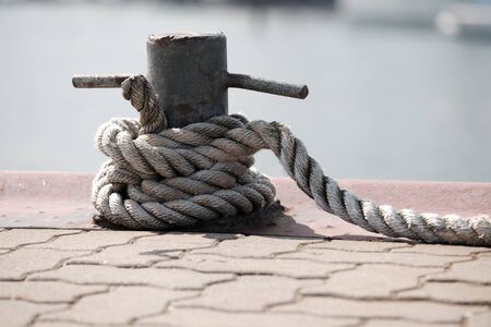 Rope of a ship or boat moored to a bollard at harbor closeup -