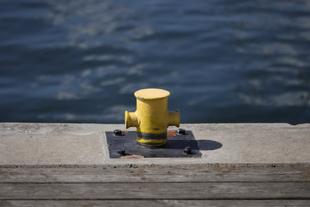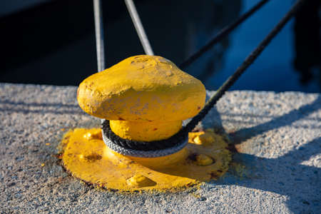 Mooring bollard concept. Ropes twisted with knobs on yellow metal steel bollard. Secured moored yachts at harbor marina quay, Greece. Close up, sunny day.